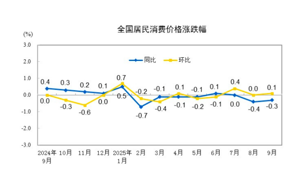 国家统计局10月15日发布的数据显示,9月CPI环比由上月持平转为上涨0.1%,同比下降0.3%,降幅比上月收窄0.1个百分点。PPI环比继续持平,同比下降2.3%,降幅比上月收窄0.6个百分点。