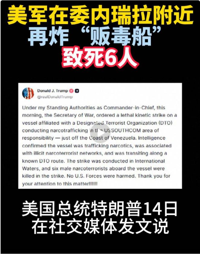 据新华国际头条,美国总统特朗普14日在社交媒体发文说,美国军方当天在委内瑞拉海岸附近的国际水域再次击沉一艘“贩毒船”,船上6人死亡。