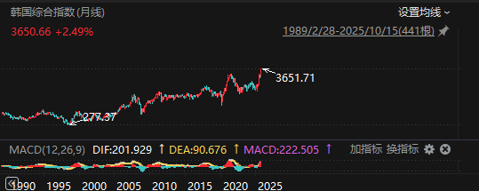 上证报中国证券网讯 10月15日午后,韩国综合指数持续走强,盘中最高至3651.71点,刷新历史新高。截至13时22分,指数涨2.49%,报3650.66点。