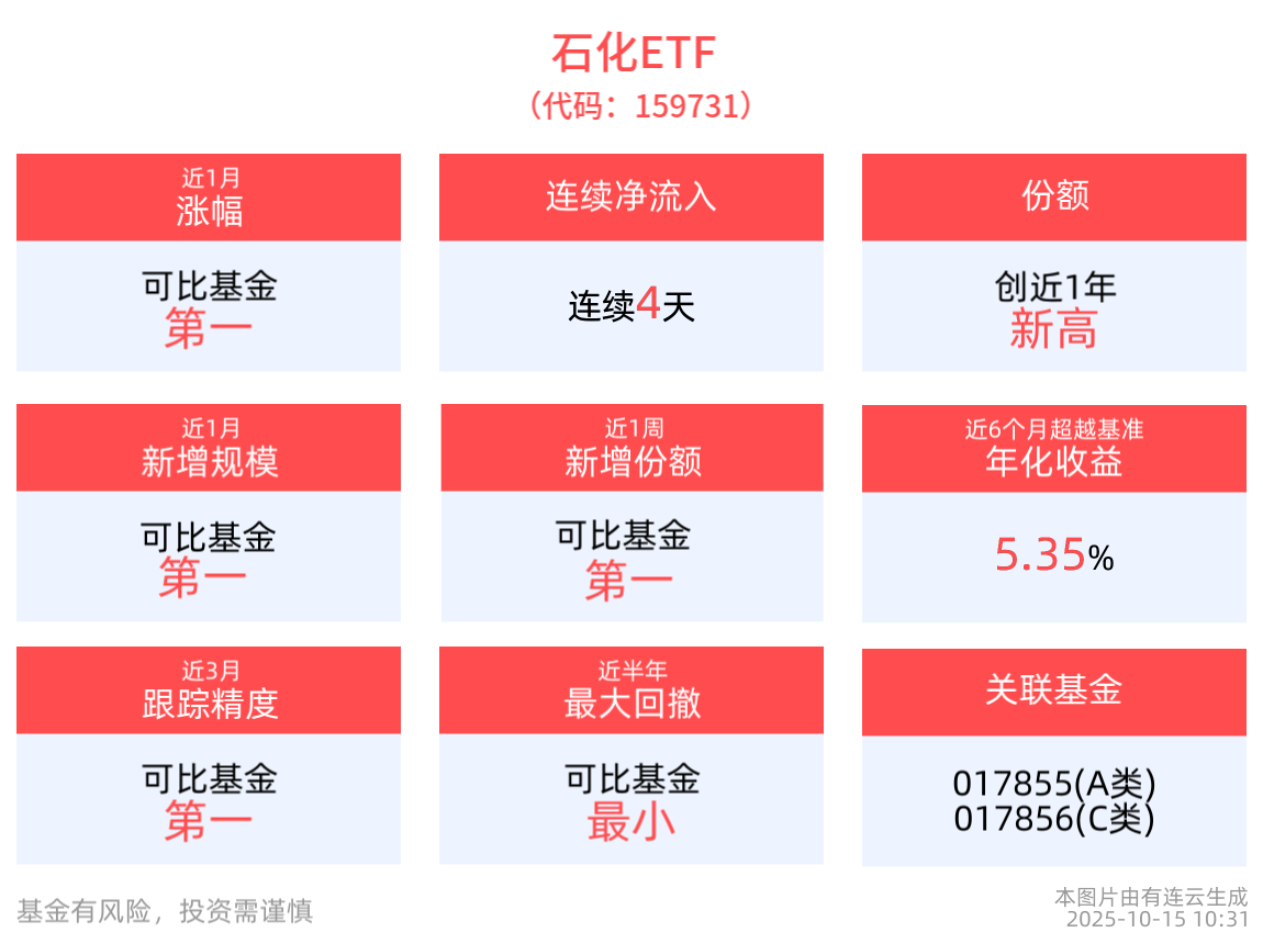 截至10月14日,石化ETF近6月净值上涨21.93%。从收益能力看,截至2025年10月14日,石化ETF自成立以来,最高单月回报为15.86%,最长连涨月数为5个月,最长连涨涨幅为22.33%,上涨月份平均收益率为5.27%。截至2025年10月14日,石化ETF近6个月超越基准年化收益为5.35%。