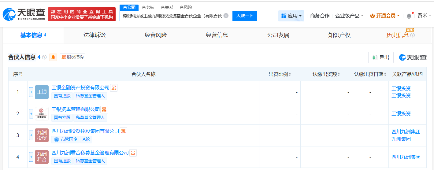 每经AI快讯,天眼查App显示,近日,绵阳科技城工融九洲股权投资基金合伙企业(有限合伙)成立,执行事务合伙人为四川九洲君合私募基金管理有限公司、工银资本管理有限公司,出资额10亿元人民币,经营范围为以私募基金从事股权投资、投资管理、资产管理等活动,由四川九洲投资控股集团有限公司及旗下四川九洲君合私募基金管理有限公司、工银金融资产投资有限公司及旗下工银资本管理有限公司共同出资。