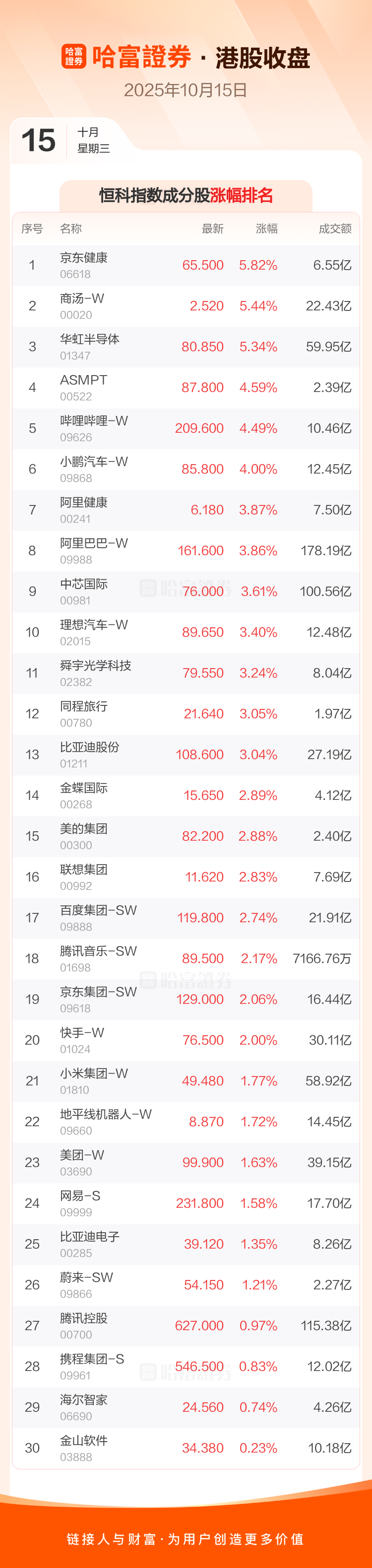 港股10月15日收盘走高,恒生指数收报25910.6点,涨469.25点,涨幅1.84%;恒生科技指数收报6075.27点,涨152.01点,涨幅2.57%。恒生指数成分股中中国人寿、京东健康、海底捞涨幅居前东方海外国际、新奥能源、恒基地产跌幅靠前恒生科技指数成分股中京东健康、商汤-W、华虹半导体涨幅居前