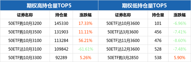 从持仓量来看,50ETF期权合约中,50ETF购10月3200持仓量最大,为145330张,期权全日上涨17.33%,报收0.0088元;持仓量最小的为50ETF沽10月3600,共计101张,期权全日下跌6.96%,报收0.4652元。