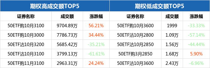 从成交额来看,50ETF期权合约中,50ETF购10月3100成交额最高,为9704.89万元,全日上涨56.21%,报收0.0528元;而最低的为50ETF购10月3600,成交额为1999元,全日下跌33.33%,报收0.0004元。