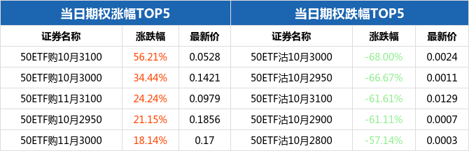 50ETF期权当日有102个合约正在交易。从涨跌幅来看,50ETF期权合约中,50ETF购10月3100涨幅最大,为56.21%,报收0.0528元;50ETF沽10月3000跌幅最大,为68.00%,报收0.0024元。