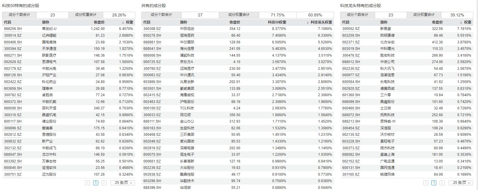 进一步对比两个指数的成分股,可以发现两个指数共有的成分股是27只,包括了中际旭创、恒瑞医药、中芯国际等,各自独有的成分股都是23只。