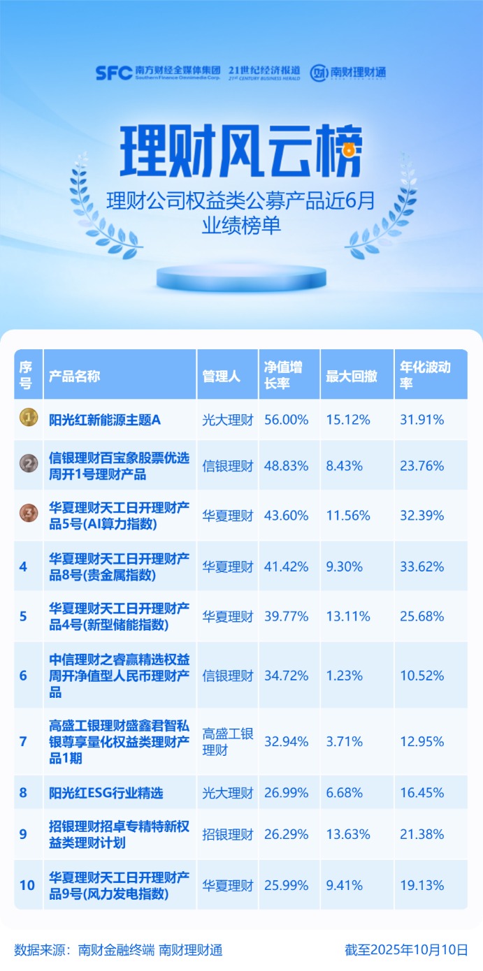 产品统计范围为理财公司权益类理财公募产品,统计截止日期为2025年10月10日,统计区间为近6个月。