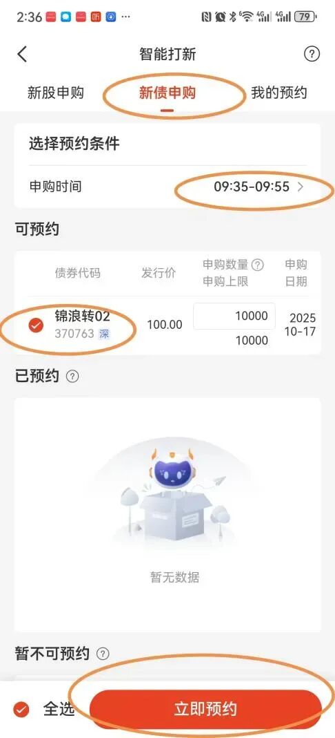其次,勾选新债申请,选好申购时间,如9点35分至9点55分,然后选择具体新债名称如锦浪转02,最后选择“立即预约”,便可完成预约申购。
