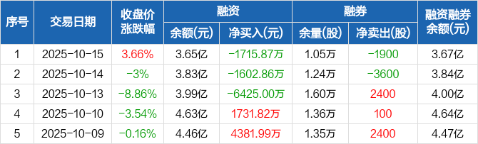 融资方面,当日融资买入3941.2万元,融资偿还5657.07万元,融资净偿还1715.87万元,连续3日净偿还累计9743.72万元。融券方面,融券卖出0股,融券偿还1900股,融券余量1.05万股,融券余额113.39万元。融资融券余额合计3.67亿元。