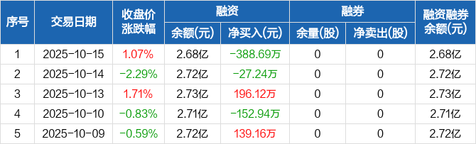 融资方面,当日融资买入335.04万元,融资偿还723.73万元,融资净偿还388.69万元。融券方面,融券卖出0股,融券偿还0股,融券余量0股,融券余额0元。融资融券余额合计2.68亿元。