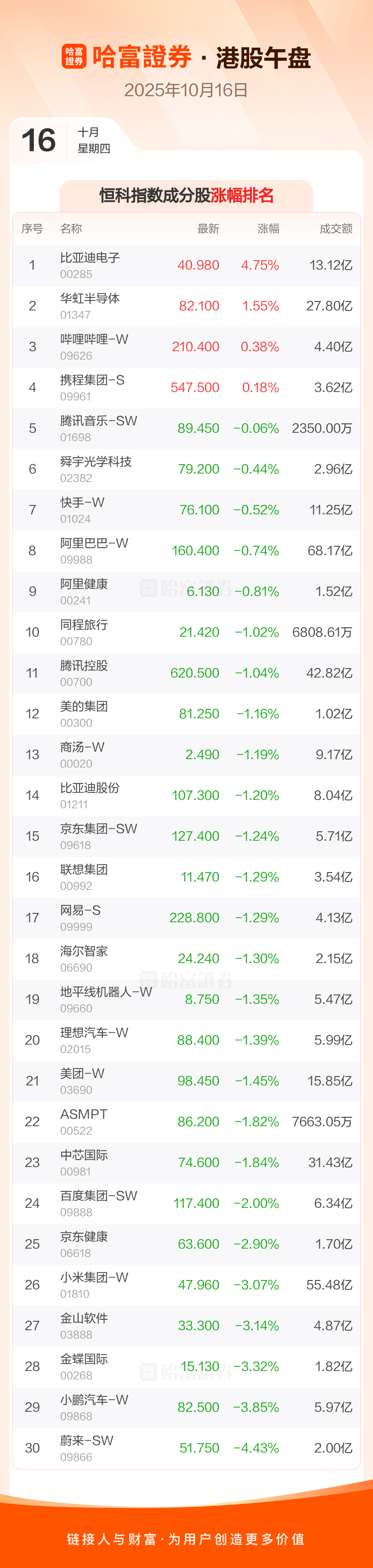港股午评:恒生指数跌0.43% 恒生科技指数跌1.36%