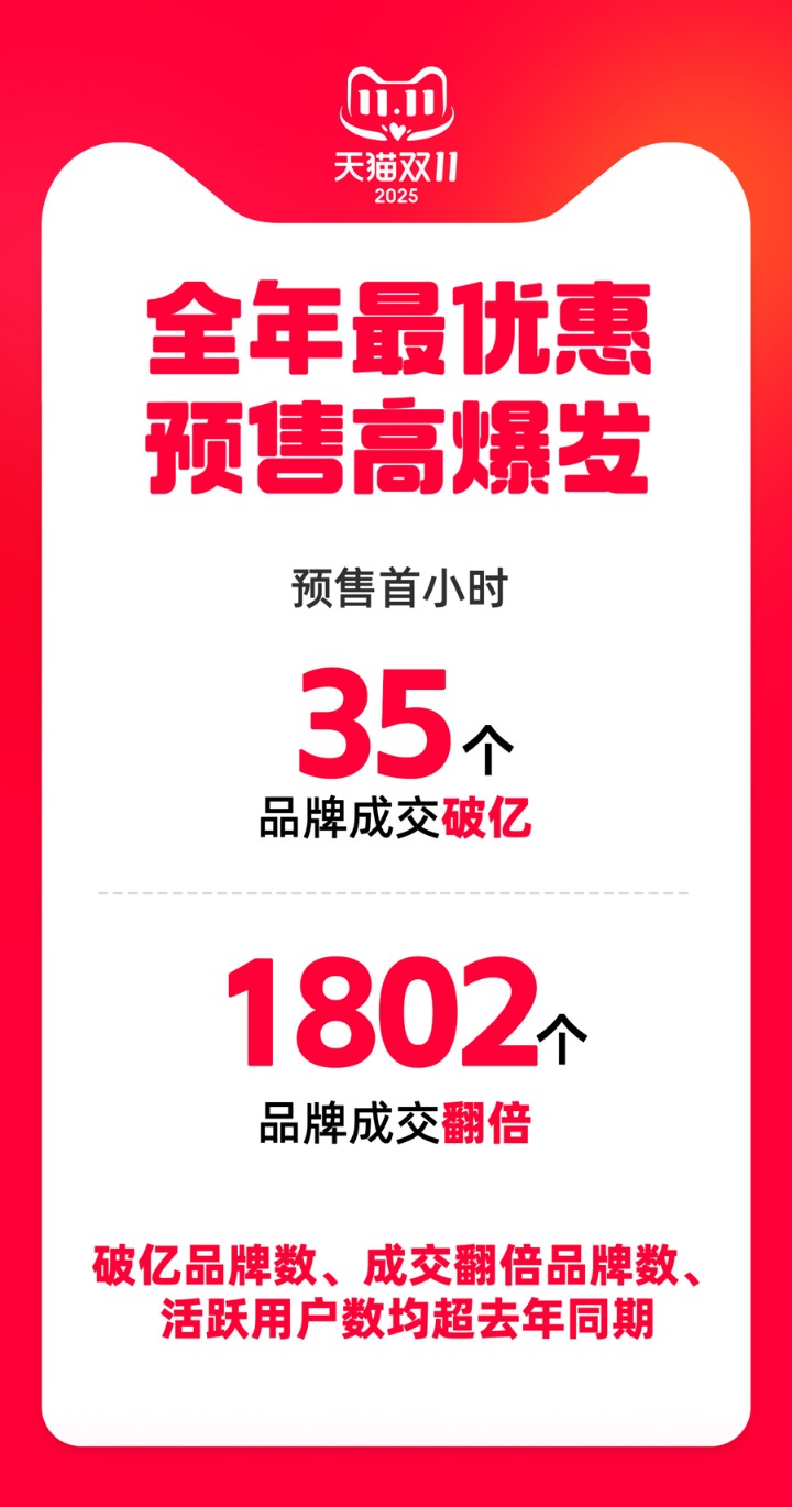 天猫双11预售首小时:35个品牌成交破亿元,1802个品牌翻倍