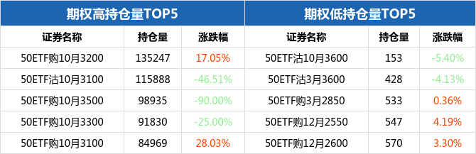 从持仓量来看,50ETF期权合约中,50ETF购10月3200持仓量最大,为135247张,期权全日上涨17.05%,报收0.0103元;持仓量最小的为50ETF沽10月3600,共计153张,期权全日下跌5.40%,报收0.4401元。