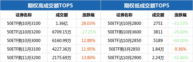 从成交额来看,50ETF期权合约中,50ETF购10月3100成交额最高,为1.36亿元,全日上涨28.03%,报收0.0676元;而最低的为50ETF沽10月2800,成交额为2751元,全日下跌33.33%,报收0.0002元。
