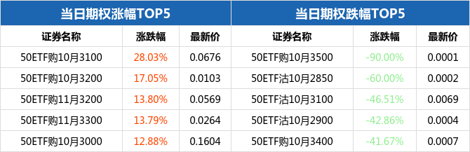 50ETF期权当日有102个合约正在交易。从涨跌幅来看,50ETF期权合约中,50ETF购10月3100涨幅最大,为28.03%,报收0.0676元;50ETF购10月3500跌幅最大,为90.00%,报收0.0001元。