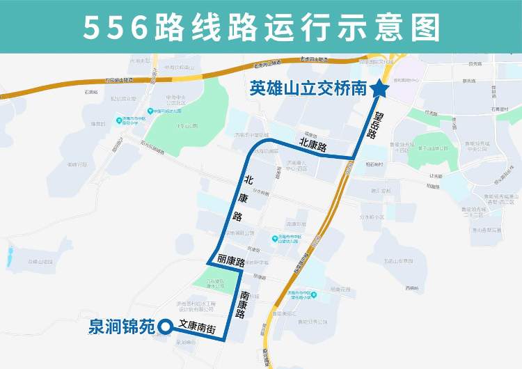 556路公交线路由英雄山立交桥南开往泉涧锦苑,主要途经望岳路、北康路、丽康路、南康路、文康南街,沿途设置英雄山立交桥南、南苑小区、北康路望岳路、唐人中心小区、北康路分水岭路、北康路宁康街、丽康路南康路、望岳康体公园、南康路文康街、泉涧智苑、经华小学、泉涧德苑、泉涧锦苑站点。