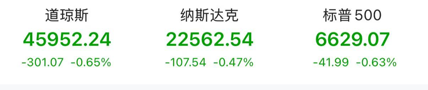 美东时间周四,美股三大股指集体收跌,截至收盘,道指跌0.65%,报45952.24点;纳指跌0.47%,报22562.54点;标普500指数跌0.63%,报6629.07点。