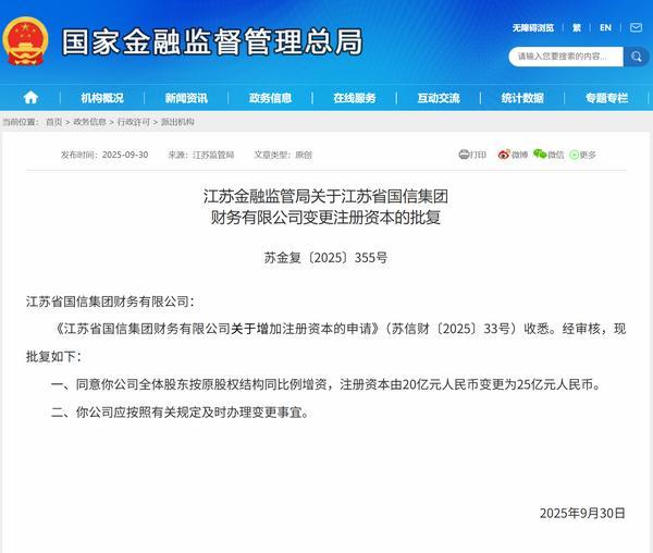 中国网财经10月17日讯日前,江苏金融监管局公布相关批复,同意江苏省国信集团财务有限公司(简称“江苏国信财务公司”)全体股东按原股权结构同比例增资,注册资本由20亿元人民币变更为25亿元人民币。以下是相关批复正文: