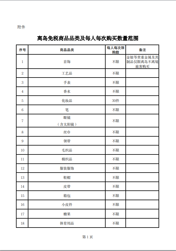 调整后离岛免税商品共47类,具体品类、购买数量、备注要求见附件,并按此执行。