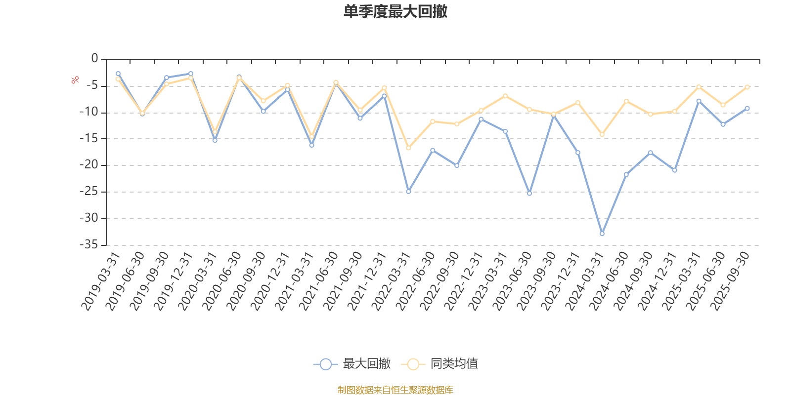 截至10月16日,基金近三年最大回撤为57.1%,同类可比基金排名1250/1275。单季度最大回撤出现在2024年一季度,为32.83%。