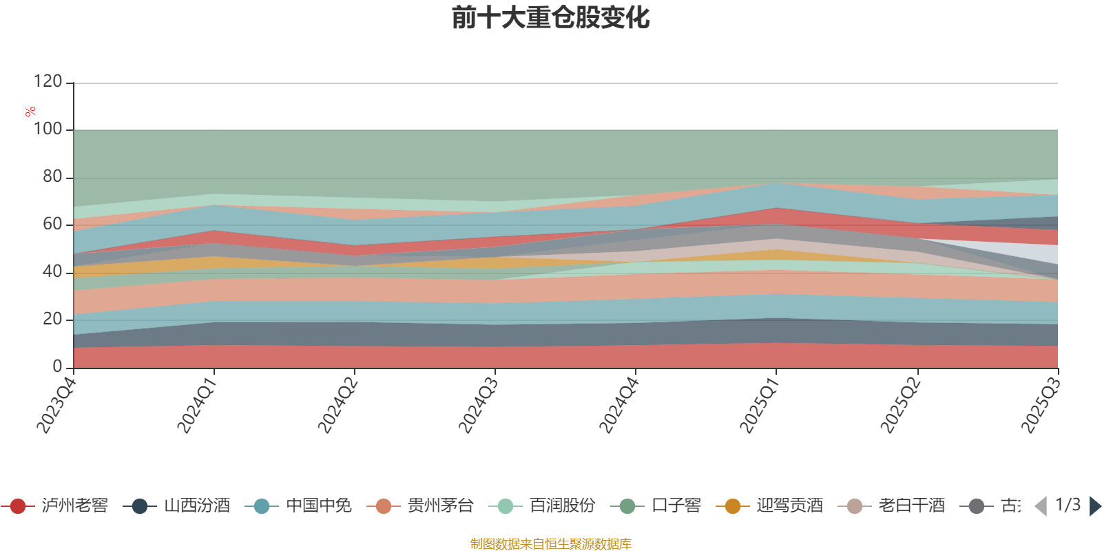 该基金持股集中度较高,近2年前十大重仓股集中度长期超过60%。截至2025年三季度末,基金十大重仓股分别是贵州茅台、中国中免、泸州老窖、五粮液、山西汾酒、双汇发展、洋河股份、今世缘、酒鬼酒、东鹏饮料。