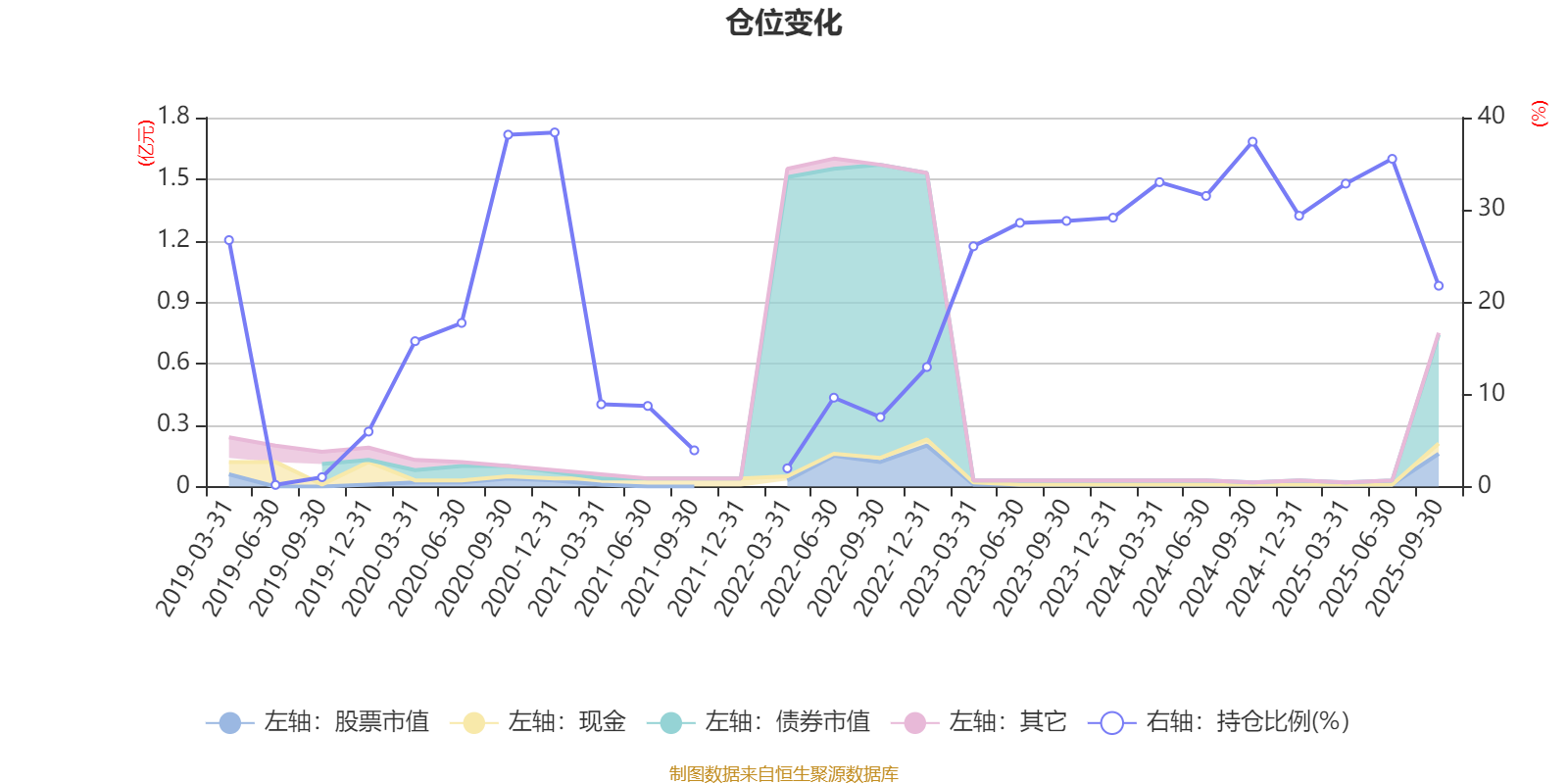 据定期报告数据统计,近三年平均股票仓位为28.91%,同类平均为19.03%。2020年末基金达到38.39%的最高仓位,2019年上半年末最低,为0.18%。