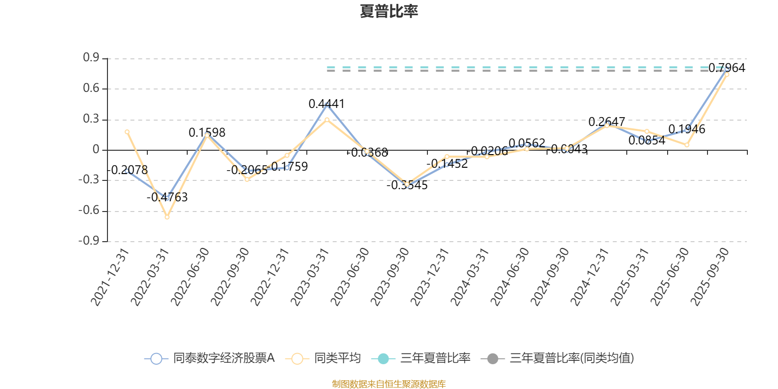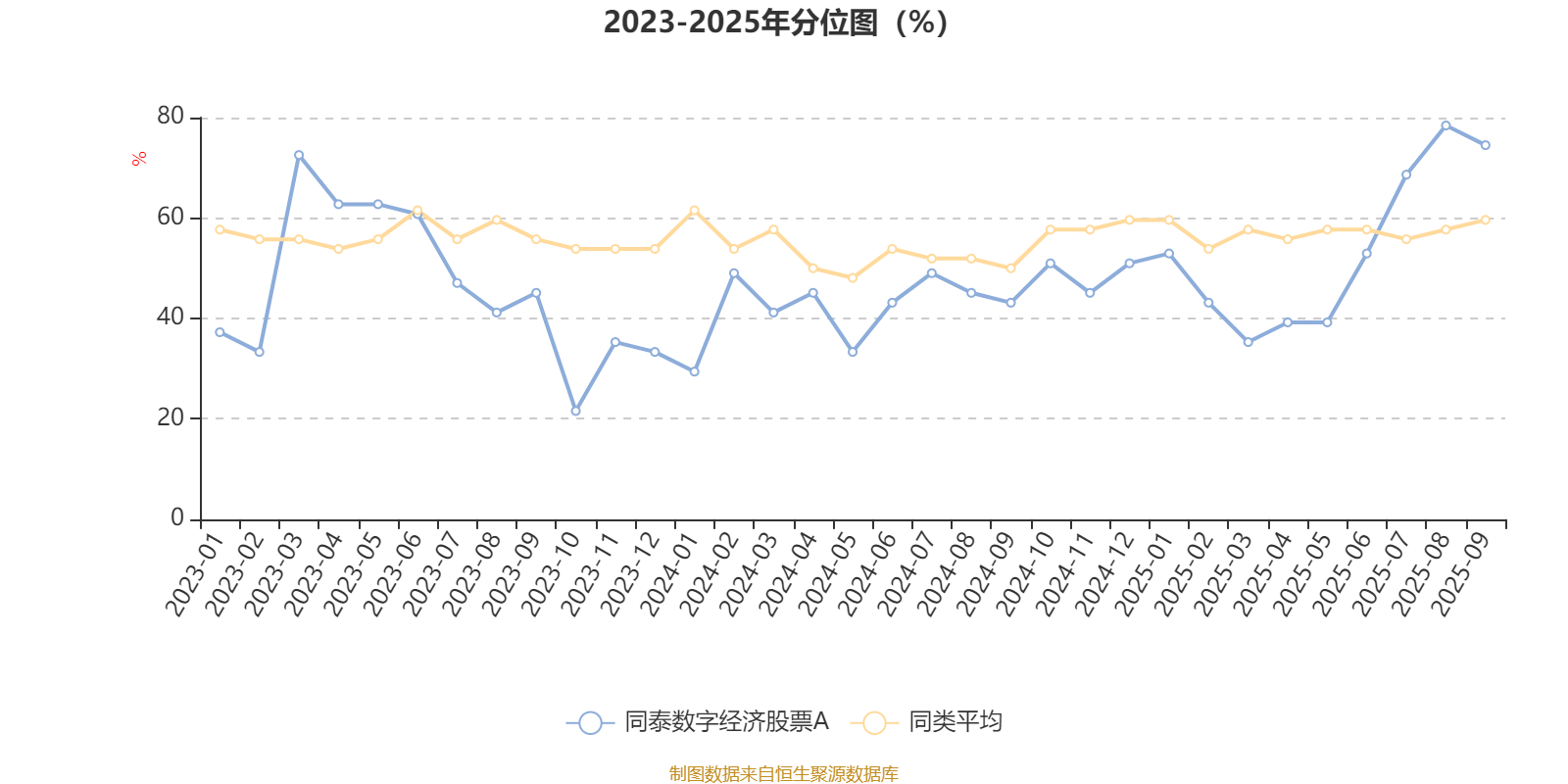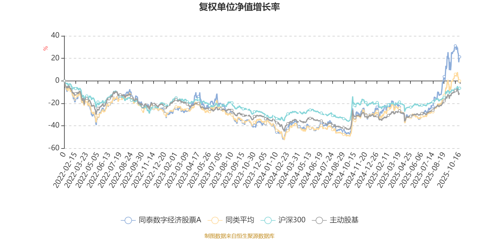 截至10月16日,同泰数字经济股票A近三个月复权单位净值增长率为48.50%,位于同类可比基金6/63;近半年复权单位净值增长率为78.47%,位于同类可比基金7/63;近一年复权单位净值增长率为86.44%,位于同类可比基金6/61;近三年复权单位净值增长率为57.47%,位于同类可比基金13/51。