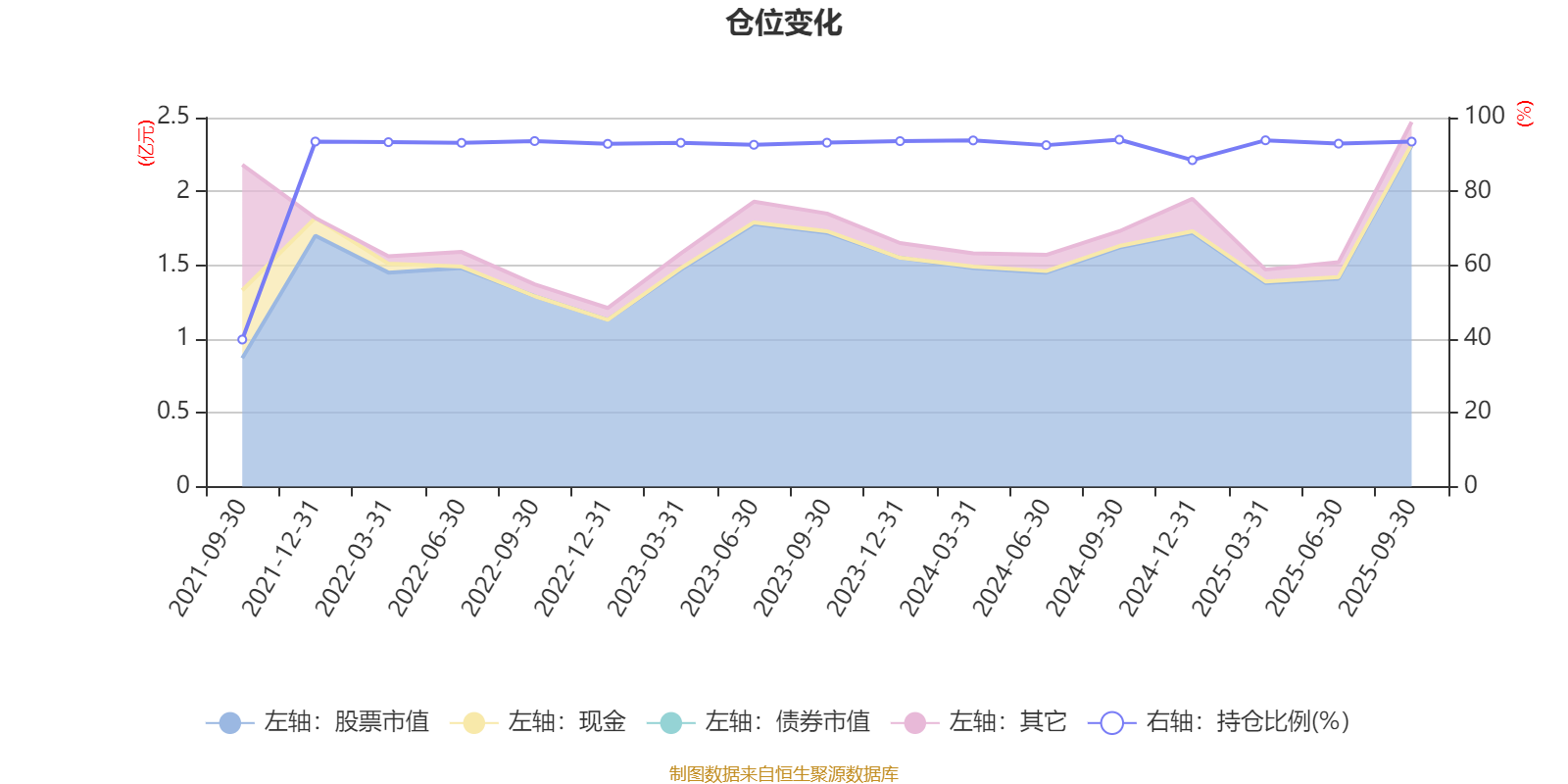 据定期报告数据统计,近三年平均股票仓位为92.89%,同类平均为88.22%。2024年三季度末基金达到94.03%的最高仓位,2021年三季度末最低,为39.85%。