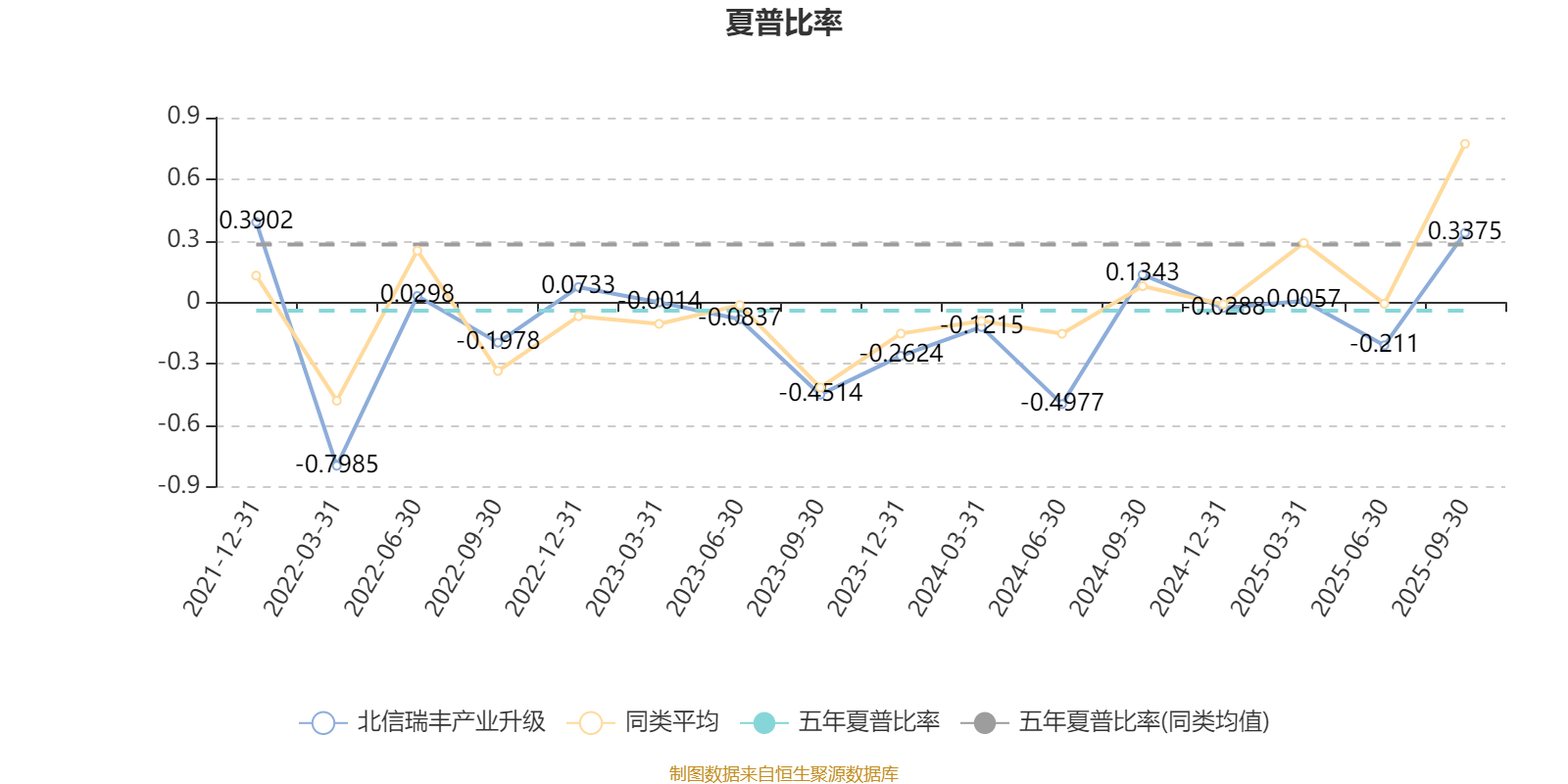 截至9月30日,基金近三年夏普比率为-0.1081,位于同类可比基金53/60。