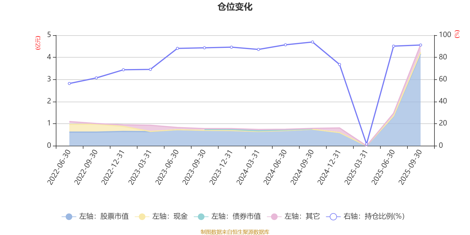 据定期报告数据统计,近三年平均股票仓位为77.74%,同类平均为83.36%。2024年三季度末基金达到93.92%的最高仓位,2025年一季度末最低,为1.62%。