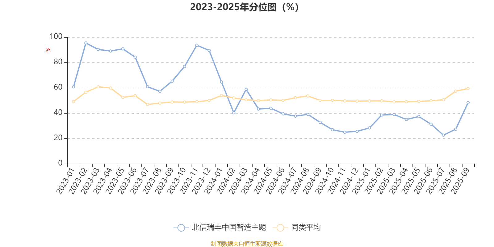 通过所选区间该基金净值增长率分位图,可以观察该基金与同类基金业绩比较情况。图为坐标原点到区间内某时点的净值增长率在同类基金中的分位数。