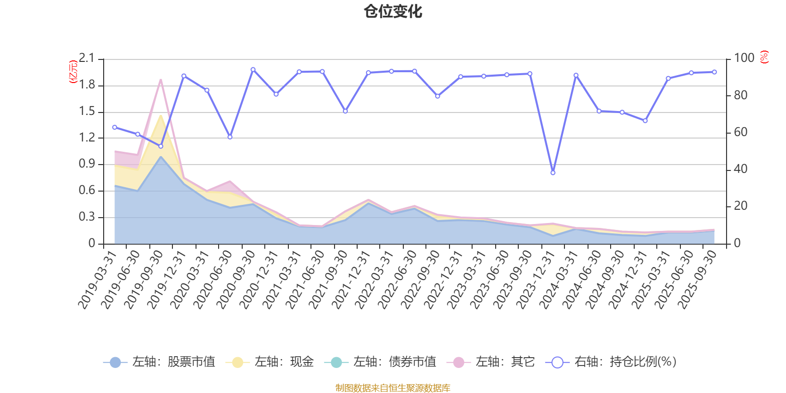 据定期报告数据统计,近三年平均股票仓位为81.57%,同类平均为72.11%。2020年三季度末基金达到94.27%的最高仓位,2023年末最低,为38.49%。