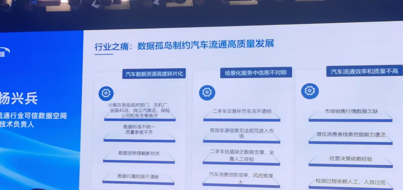 杨兴兵认为,“数据孤岛”制约着汽车流通行业的高质量发展。“从新车的销售到二手车的交易,再到金融、保险、维修、保养,到动力电池的维修、报废拆解,数据分散在不同的主体手里,包括主机厂、经销商集团等。”杨兴兵解释称,分散的数据资源,无论是标准还是质量都是参差不齐的,这些数据无法有效形成数据价值,最终在多元化场景当中,制约了场景价值的应用,导致汽车流通的效率和质量不高。