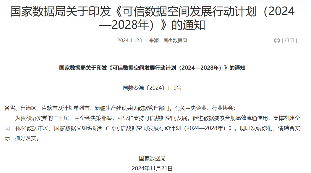 去年11月,国家数据局就正式发布《可信数据空间发展行动计划(2024—2028年)》,提出“到2028年,建成一批覆盖重点行业和区域的可信数据空间,形成较为完善的技术体系、标准体系、政策体系和生态体系,数据要素流通效率显著提升” 的目标,并明确在新能源汽车、能源等重点行业开展创新发展试点。