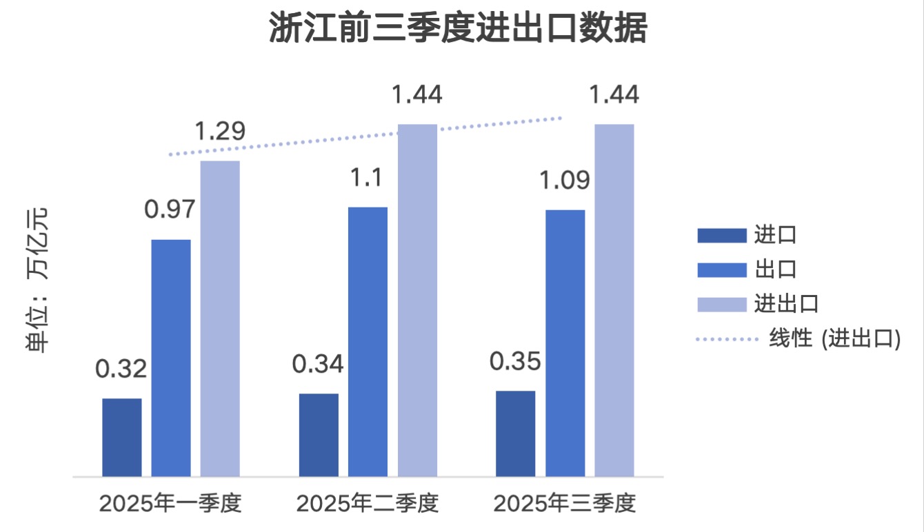 通过对前三个季度的数据梳理可以发现,2025年以来,浙江外贸进出口总量正保持着稳健的增长态势,与2024年全年浙江5.26万亿元的外贸进出口总量仅差1.09万亿元。