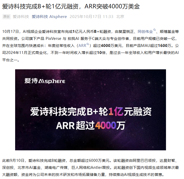 每经AI快讯,10月17日,AI视频企业爱诗科技宣布完成1亿元人民币B+轮融资,由复星锐正、同创伟业、顺禧基金等共同投资。爱诗科技公布的数据显示,旗下产品PixVerse与拍我AI用户规模已突破一亿,年度经常性收入(ARR)超过4000万美元,公司于2024年11月正式商业化。