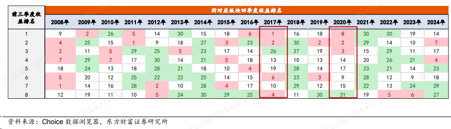 Q4容易发生占优行业和风格的切换,09年以来前三季度上涨的板块通常难以在四季度普遍延续优异的表现,或与资金在年末选择盈利兑现的偏好相关。