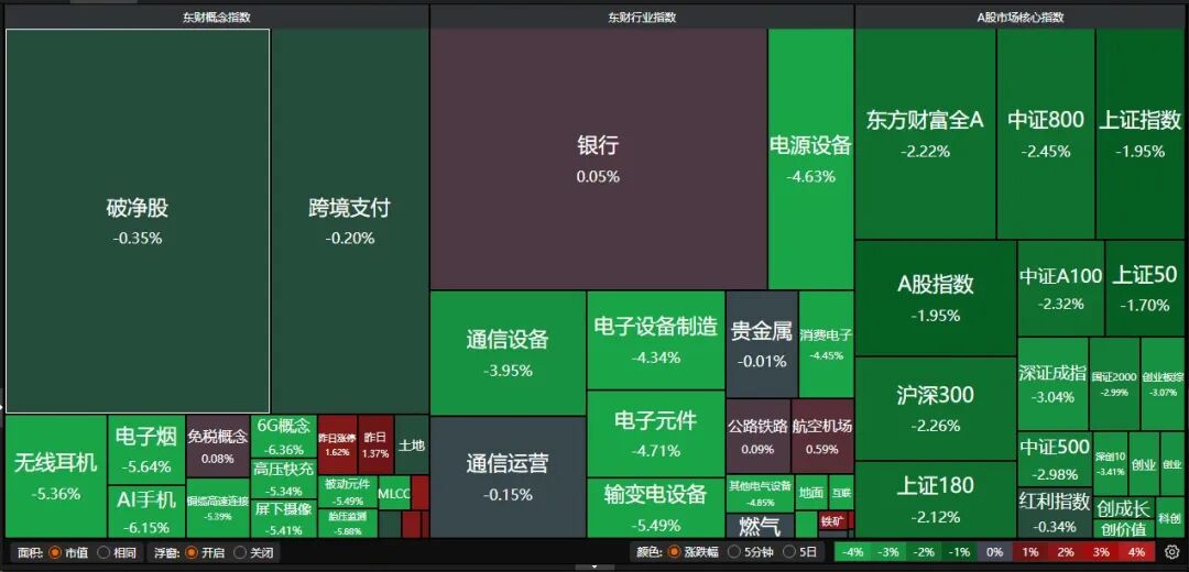 昨日A股三大指数集体回调,截止收盘,沪指跌1.95%,深证成指跌3.04%,创业板指跌3.36%。沪深两市成交额超过1.9万亿,较上一日微幅放量。行业板块呈现普跌态势,电源设备、电网设备、光伏设备、风电设备、半导体、电子元件、消费电子、电池、电子化学品板块跌幅居前,仅贵金属、燃气、航空机场板块逆市上涨。个股方面,近4800只股票下跌,逾40只股票涨停。