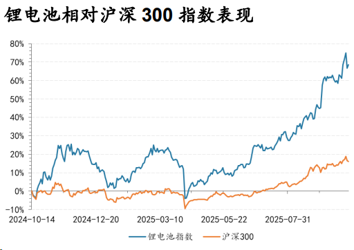 9月锂电池板块指数走势强于沪深300指数。2025年9月,锂电池指数上涨17.12%,新能源汽车指数上涨16.22%,而同期沪深300指数上涨2.59%,锂电池指数走势强于沪深300指数。