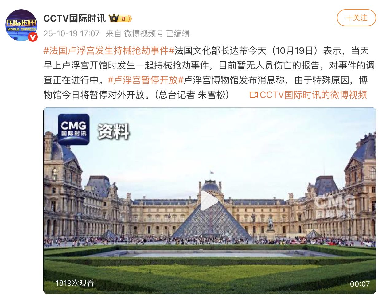 突发!法国卢浮宫发生持械抢劫事件