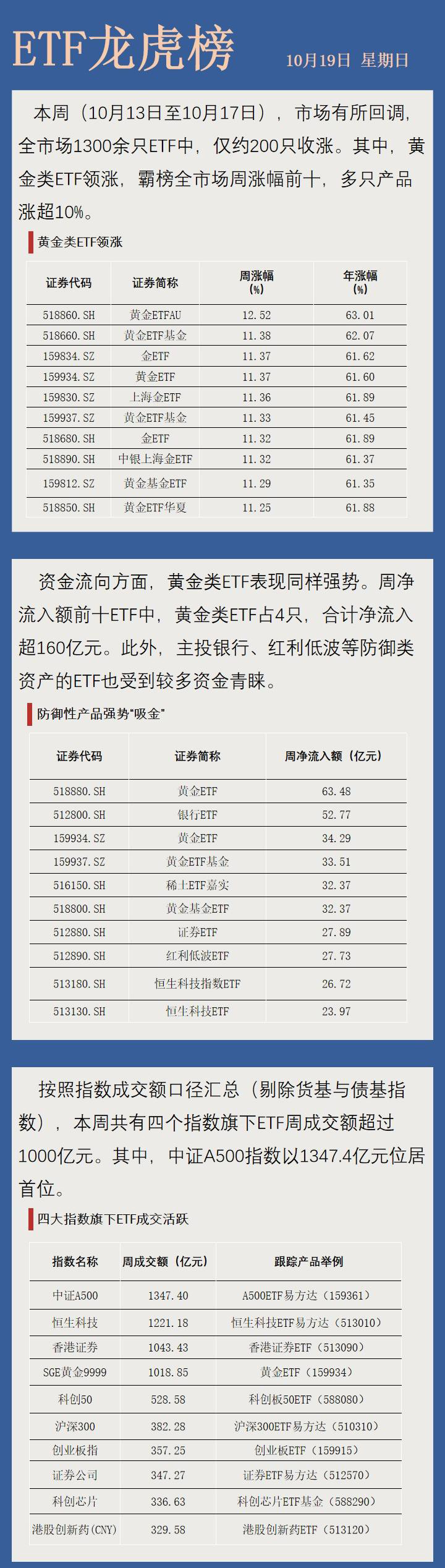 【ETF龙虎榜】黄金类ETF领涨,多只产品本周涨超10%