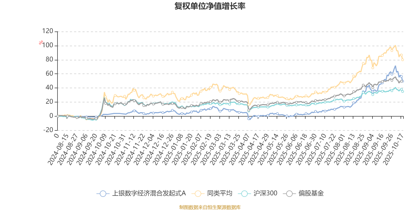 截至10月17日,上银数字经济混合发起式A近三个月复权单位净值增长率为36.09%,位于同类可比基金55/229;近半年复权单位净值增长率为49.94%,位于同类可比基金75/229;近一年复权单位净值增长率为45.91%,位于同类可比基金127/213。