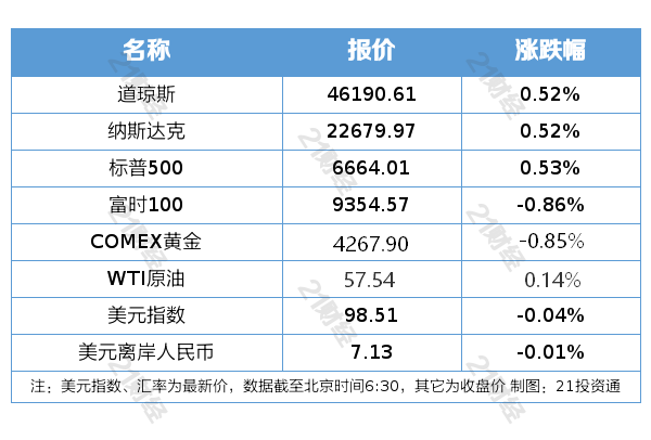 纽约股市三大股指10月17日上涨。截至10月17日收盘,道琼斯工业平均指数比前一交易日上涨238.37点,收于46190.61点,涨幅为0.52%;标准普尔500种股票指数上涨34.94点,收于6664.01点,涨幅为0.53%;纳斯达克综合指数上涨117.44点,收于22679.97点,涨幅为0.52%。