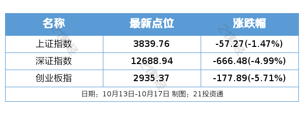 本周(10月13日—10月17日),A股三大指数全线下跌。截至10月17日收盘,上证指数报3839.76点,周跌1.47%;深成指报12688.94点,周跌4.99%;创业板指报2935.37点,周跌5.71%。