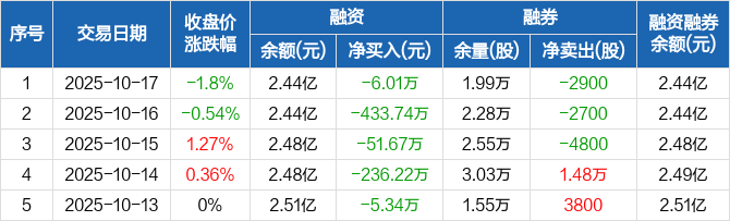 天虹股份融资融券信息显示,2025年10月17日融资净偿还6.01万元;融资余额2.44亿元,较前一日下降0.02%
