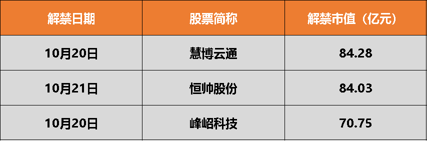 具体来看,慧博云通、恒帅股份、峰岹科技分别在10月20日、10月21日、10月20日解禁1.57亿股、8002万股、3650万股,均为首发原股东限售股份。