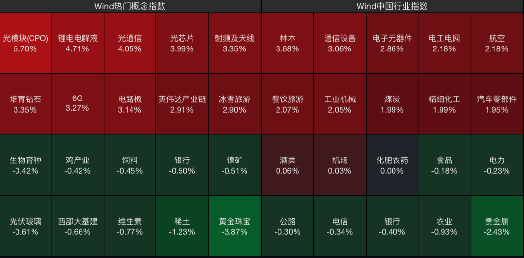 从板块看,大多数板块飘红,光模块(CPO)、锂电电解液、光通信、光芯片概念板块涨幅居前,通信设备、电子元器件、林木、餐饮旅游、煤炭板块上涨;贵金属板块领跌,稀土、银行等板块回调。