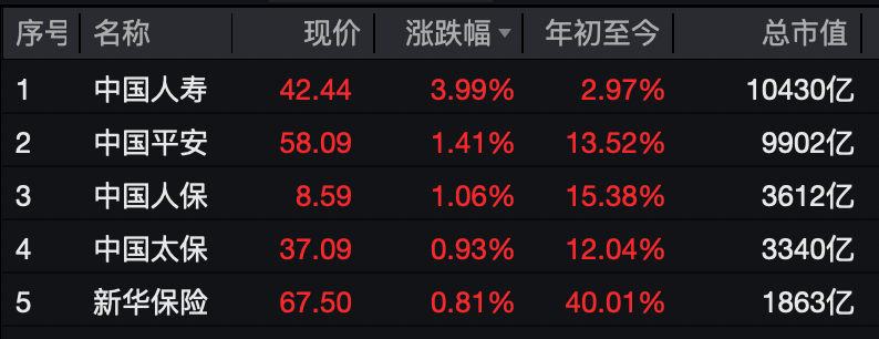 保险股全线上涨,中国人寿涨近4%,现报42.44元/股,最新市值为10432亿元。