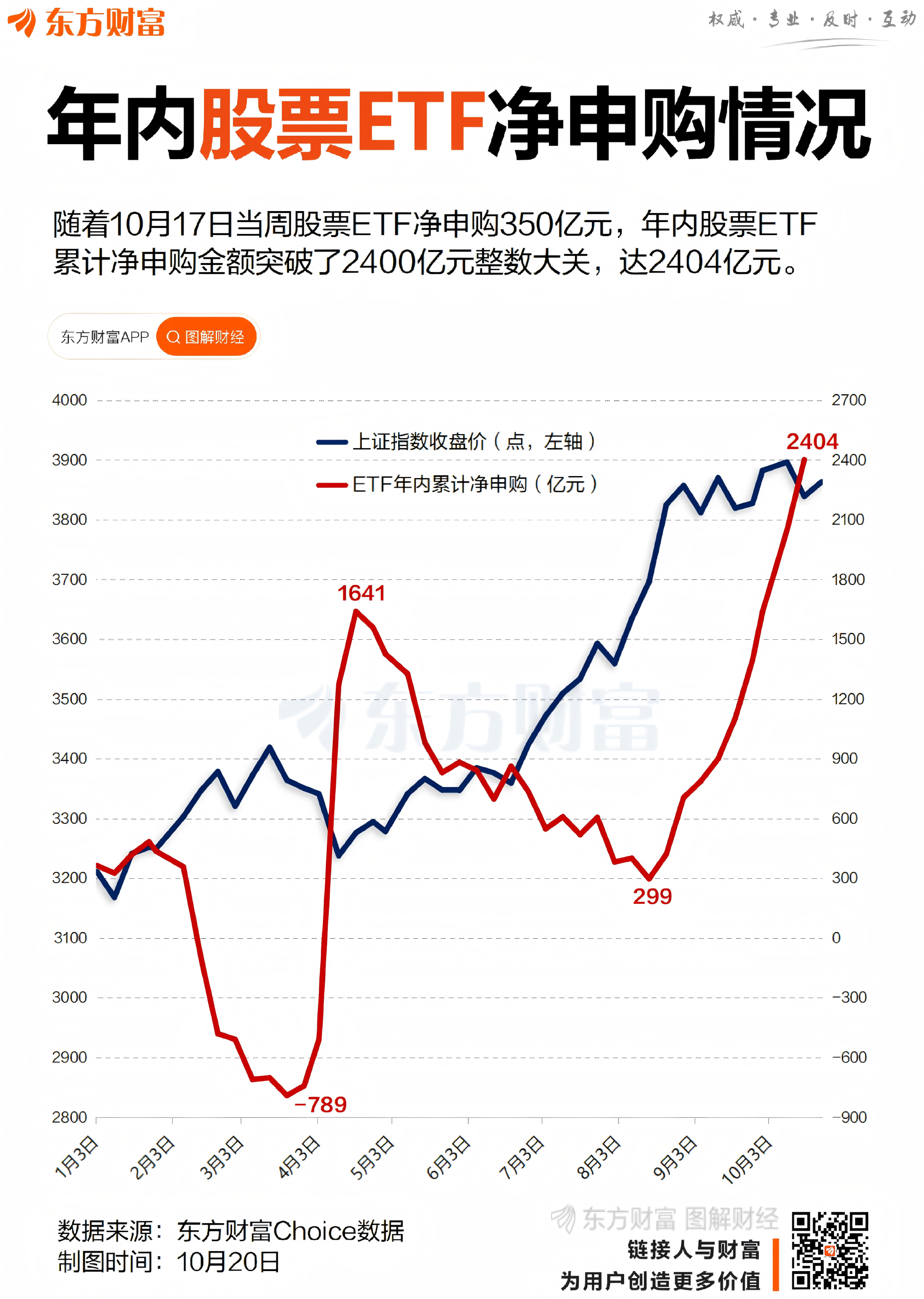 据东方财富Choice数据,随着10月17日当周股票ETF净申购350亿元,年内股票ETF累计净申购额突破了2400亿整数大关,达2404亿元。
