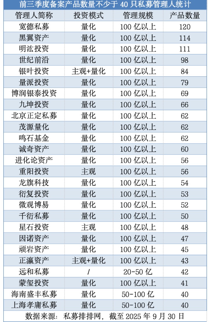 据私募排排网统计,前三季度,百亿量化私募宽德私募以120只的备案产品数量居于行业首位。紧随其后的是黑翼资产、明汯投资、世纪前沿,备案产品数量分别为114只、111只和98只,这3家均为百亿量化私募管理人。